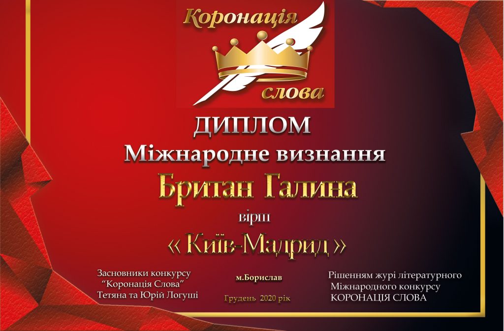 - 2020 р. Дипломант конкурсу «Коронація слова» 2020 у номінації «Пісенна лірика» — спецвідзнака «Міжнародний вибір».